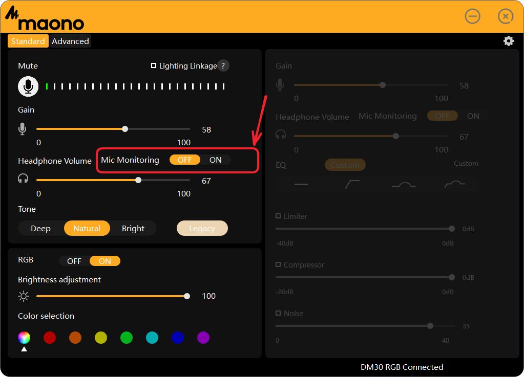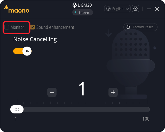Maono台灣 麥克風常見問題 2025-12-21 全文內容 Toggle 關於麥克風監聽方案一:透過複選框停用監控 方案二:透過麥克風監聽開關關閉監聽。 方案 3:調整監聽混音器以停用監聽 關於麥克風監聽 如果你能在耳機裡聽到自己的聲音,這是因為USB麥克風的 直接監聽功能已啟用。 此功能可將麥克風訊號直接回饋至耳機,從而實現音量、清晰度和效能的即時監控。它常用於播客、採訪和直播等場景。 如果您不想聽到自己的聲音,請按照以下指南停用麥克風監聽。 筆記 1. 麥克風的即時監聽功能在 硬體層面運行,與電腦或軟體設定無關。 2. 停用監聽 不會影響其他人在錄音或直播中聽到的音訊。 3. 極低或零延遲是此功能的正常特性,並不表示系統故障。 方案一:透過複選框停用監控 支援的型號: DGM20、PD200W 部分型號的軟體中包含「監聽」複選框。若要停止聽到自己的聲音,只需取消選取此核取方塊即可停用麥克風監聽。 提示:若要停用 DGM20 上的麥克風監聽功能,您必須先將其更新至最新的韌體版本 1.0.9。 方案二:透過麥克風監聽開關關閉監聽。 支援的型號: DM30、DM30 RGB、DM40系列、PD100X、PD100X RGB、PD200X、PD400X 在 Maono Link中,找到麥克風監聽開關。將其設為「關閉」即可停用透過監聽聽到自己的聲音。 方案 3:調整監聽混音器以停用監聽 支援的型號: PD300X、PM450 在 Maono Link中,將監聽混音器滑桿向PC 音訊方向移動,即可停止聽到自己的聲音。 - 0 Share on Facebook Share on X